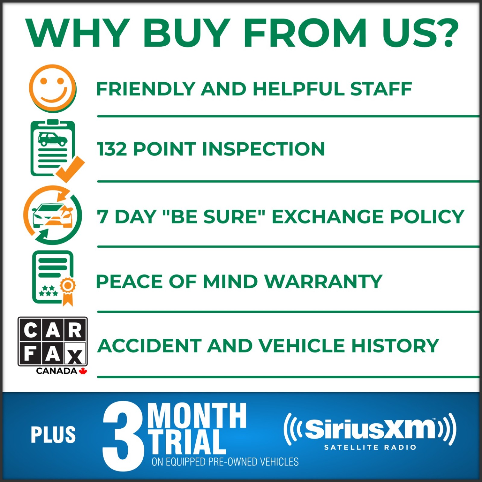 The 7-day or 500km vehicle exchange policy allows you to "Be Sure" that you have chosen the right vehicle. The vehicle can be exchanged for any reason. Simply contact our staff in writing stating you would like to exchange the vehicle within the first 7 days of ownership. Pick a new vehicle and give back your old one.